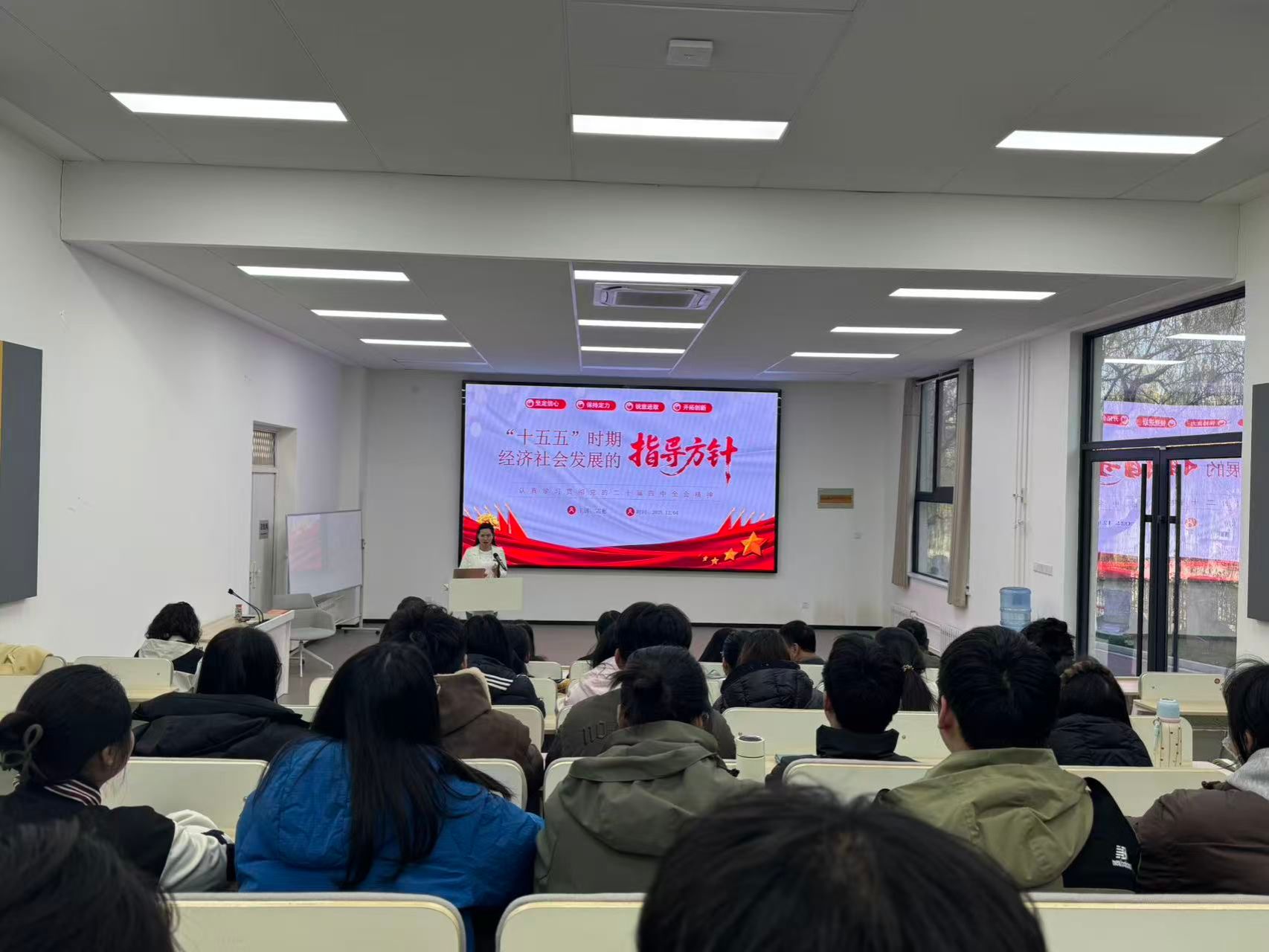 为精准把握规划核心内涵,引导学生融入时代发展的重要教学资源。12月4日,国际商学院党委于终南大讲堂成功举办聚焦"十五五"时期经济社会发展指导方针——认真学习贯彻党的二十届四中全会精神辅导报告的讲座。讲座由我校马克思主义学院博士、副教授雷彬老师主讲,特邀校党委委员、组织部李雪莹部长参加,国际商学院党委委员、支部书记、教师党员代表、全体学生党员参加,共计100人,报告由分党委委员马艳红主持。
