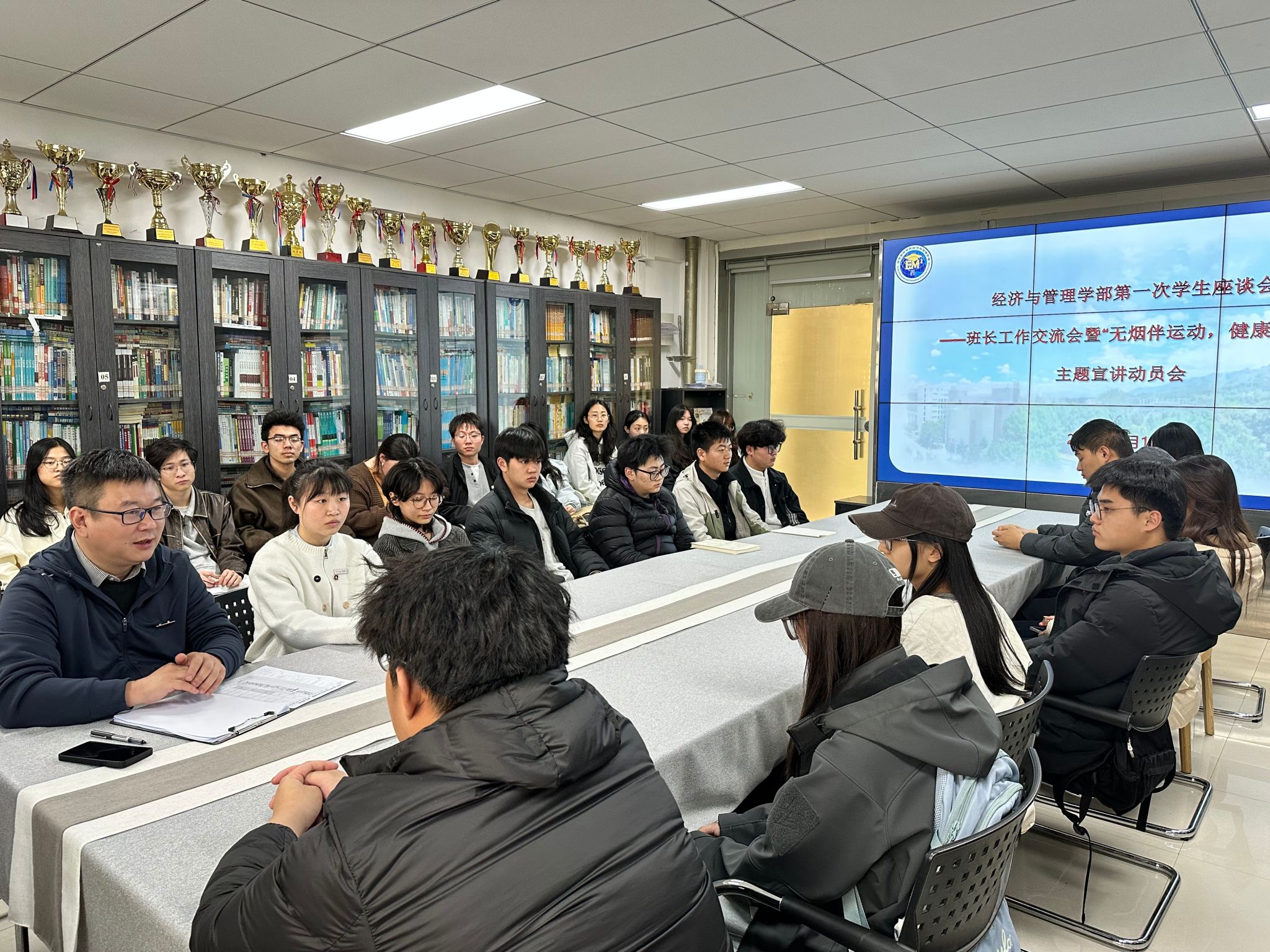 为进一步加强班级管理效能,营造文明健康的校园氛围,2025年3月11日中午,经济与管理学部召开第一次学生座谈会——班长工作交流会暨“无烟伴运动,健康伴成长”主题宣讲动员会。学部综合办副主任胡松武、学生会主席团成员刘苏莹同学、2025级和2024级全体班长参加会议。会议由刘苏莹同学主持。
