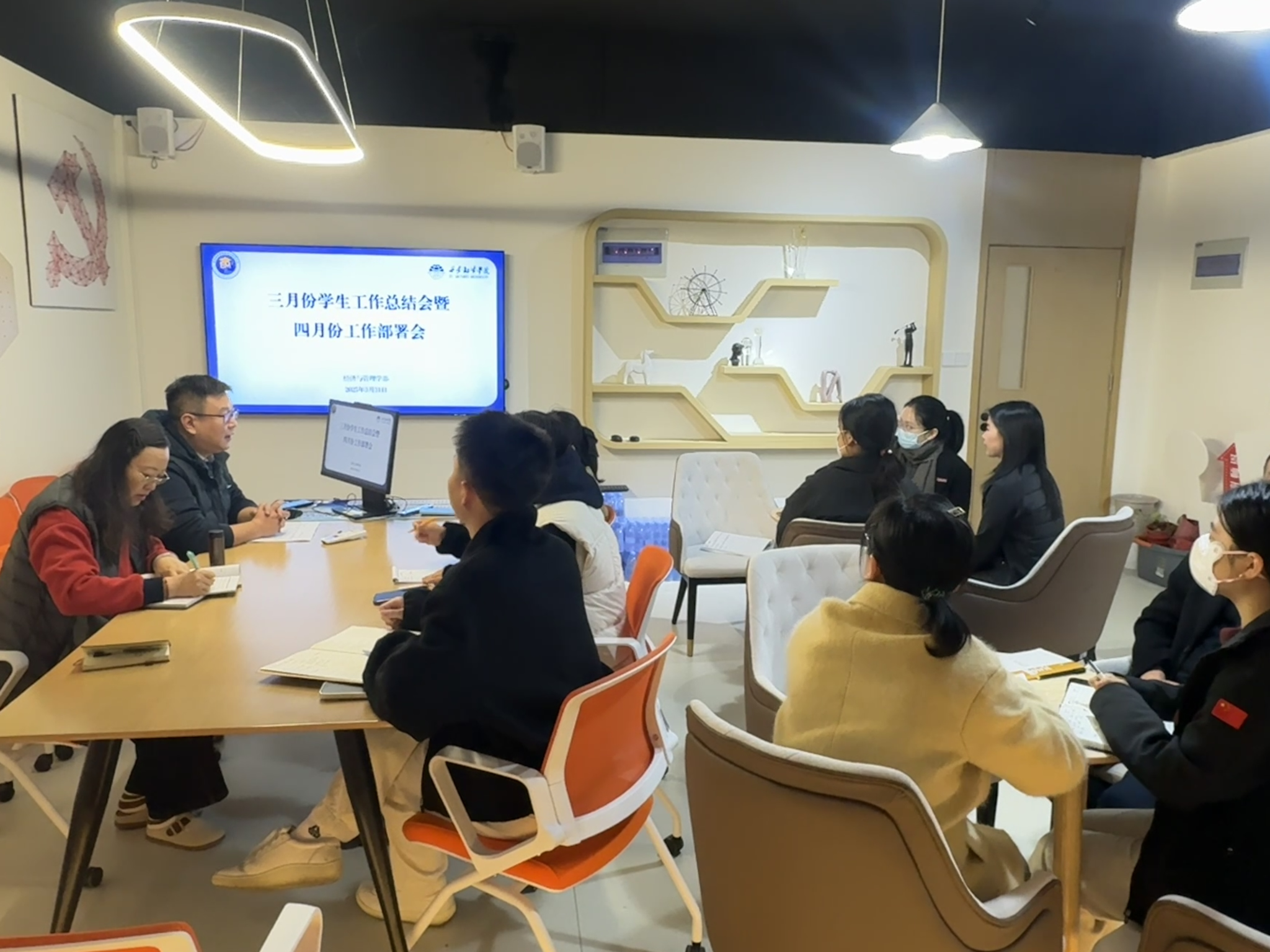 学习结束后,胡松武副主任围绕三月份学生工作,从安全稳定、日常事务管理两方面全面复盘。安全稳定方面,通报两起学生人际矛盾案例,分析成因及处置过程,强调此类矛盾易危害学生心理健康,要求辅导员坚持“早发现、早介入、重疏导、重修复”原则,兼顾纪律与人文关怀;同时详解应急处置流程,明确急救电话、上报流程等关键环节。